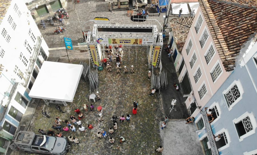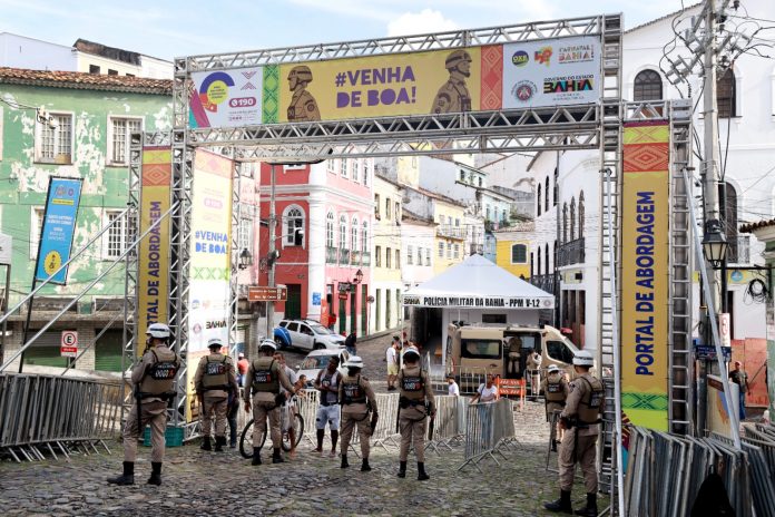 O Largo do Pelourinho registrou um movimento diferente nesta quarta-feira (7) com a realização de um simulado no Portal de Abordagem que dá acesso ao circuito do Carnaval no Centro Histórico. A ação faz parte de uma operação de segurança que emprega três mil policiais em 42 portais de abordagem espalhados nos três circuitos do Carnaval de Salvador 2024.