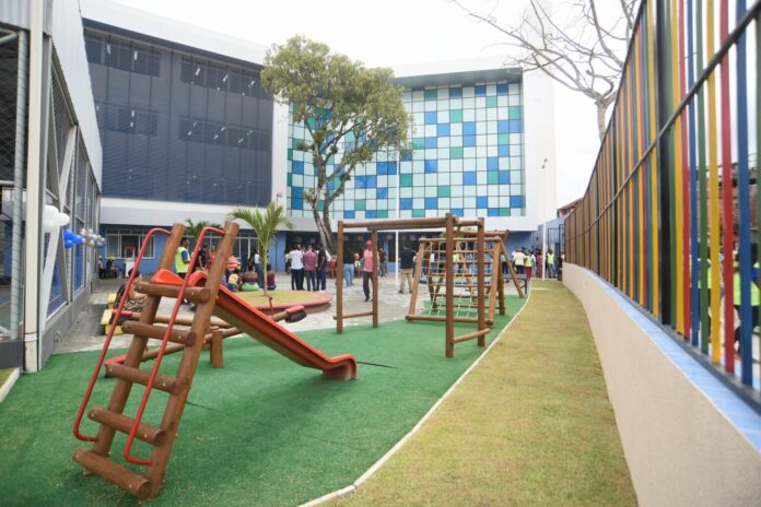 Com um investimento de R$16,5 milhões, a nova escola ocupa uma área de 3,3 mil metros quadrados e tem quatro andares. São 18 salas de aula climatizadas, quadra coberta, auditório, brinquedoteca, sala de leitura, refeitório, playground, além de espaços multiuso e salas de Atendimento Educacional Especializado (AEE). A unidade também se destaca pela acessibilidade total e por soluções sustentáveis, como captação de energia solar e reutilização de água pluvial.