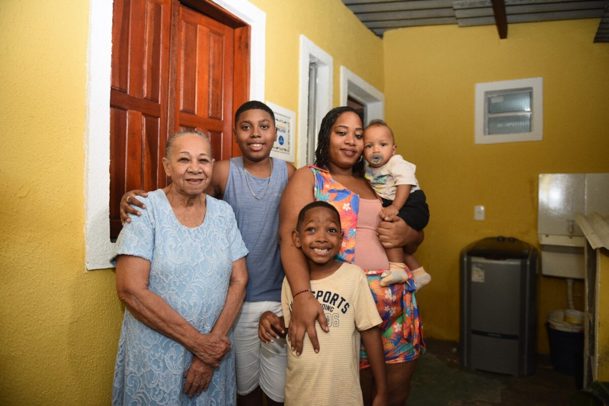 Uma das famílias beneficiadas no Engenho Velho da Federação foi a de Ana Mércia Santana, de 38 anos, nascida e criada na comunidade. Ela é mãe solo de três filhos – João Pedro, de 13 anos, Paulo Alexandre, de 7 anos, e Erick, de 11 meses. Segundo ela, a casa estava cheia de mofo por causa da pingueira de quando chovia e as crianças já estavam ficando doentes.