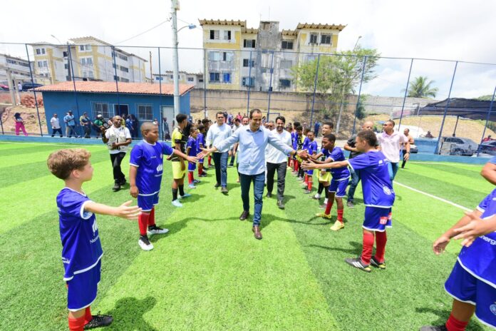 A Prefeitura de Salvador inaugurou nesta segunda-feira (16) mais três campos com grama sintética para o incentivo à prática de esportes e lazer nos bairros de São Marcos – contemplado com dois equipamentos – e Tancredo Neves, totalizando investimentos de cerca de R$4,5 milhões. As localidades farão parte do projeto Bora Bahêa Meu Bairro, parceria entre a administração municipal e o Bahia SAF, que vai beneficiar ao menos 240 crianças e adolescentes entre 6 e 14 anos com aulas gratuitas de escolinha de futebol.