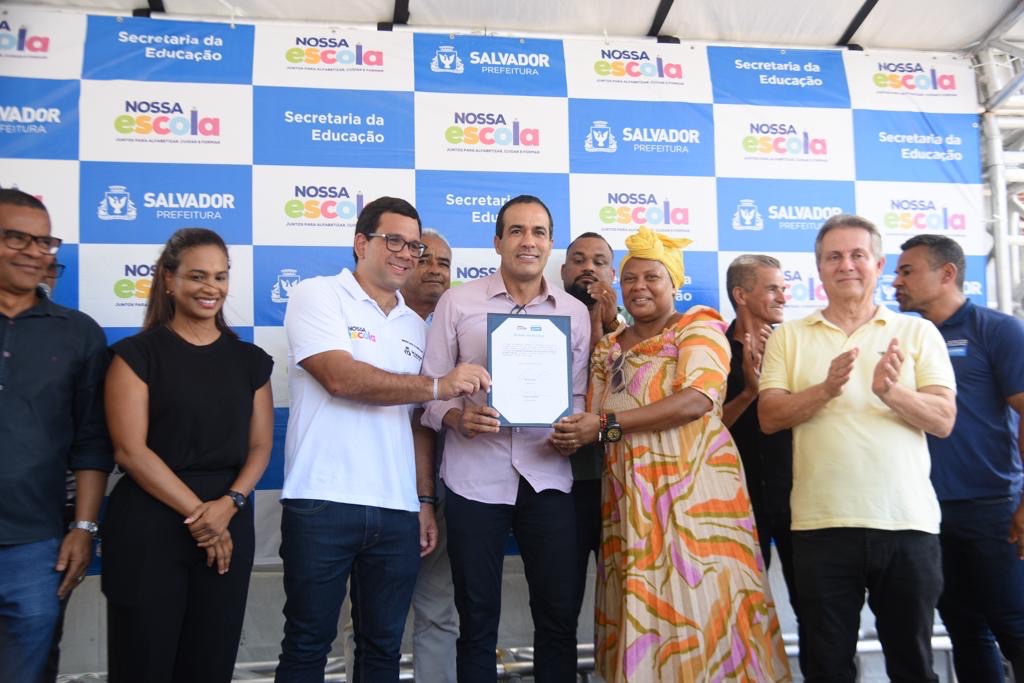 Mais uma unidade escolar da capital baiana foi alcançada com a estratégia da Prefeitura em qualificar a infraestrutura da rede de ensino. O prefeito Bruno Reis e o secretário municipal da Educação, Thiago Dantas, assinaram nesta quarta-feira (6) a ordem de serviço para reconstrução do Centro Municipal de Educação Infantil (Cmei) Álvaro Bahia, em Paripe, que sairá de 80 vagas para 300, ou seja, mais que triplo da capacidade de alunos, além de ter salas climatizadas e instalações modernas. O valor investido na obra será de R$10 milhões.