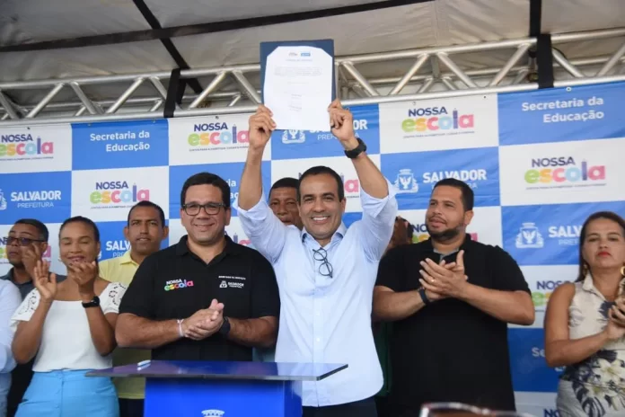 Salvador ganhará mais cinco escolas de alto padrão com instalações modernas, acessibilidade e conforto para o aprendizado escolar. O pacote de obras abrange investimento de R$ 79,6 milhões e foi anunciado pelo prefeito Bruno Reis e pelo secretário municipal da Educação (Smed), Thiago Dantas, nesta segunda-feira (4), durante assinatura da ordem de serviço para a reconstrução da Escola Municipal Jesus de Nazaré, em Sussuarana, uma das unidades alcançadas com a iniciativa.