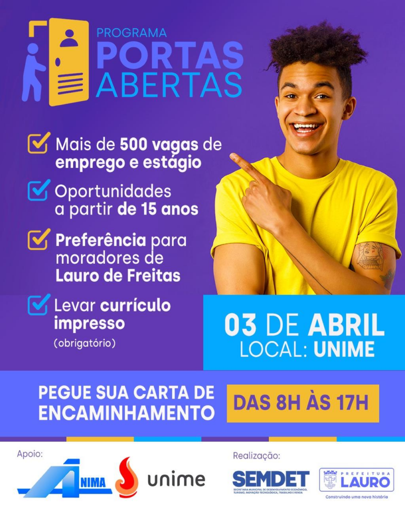 A Prefeitura de Lauro de Freitas, por meio da Secretaria do Desenvolvimento Econômico, Turismo, Inovação Tecnológica, Trabalho e Renda (SEMDET), promove nesta quinta-feira (3/4), o Programa Portas Abertas que oferece mais de 500 vagas de emprego e estágio para moradores a partir de 15 anos. A iniciativa, realizada em parceria com a Ânima Recursos Humanos, será das 8h às 17h, na Faculdade Unime, localizada na Avenida Luiz Tarquínio Pontes, e promete movimentar o mercado de trabalho na cidade.