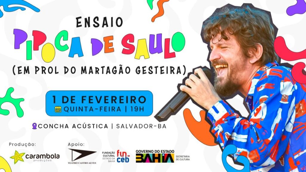 O cantor Saulo fará uma apresentação especial na Concha Acústica (TCA), em Salvador, no dia 1º de fevereiro, às 19h, com 100% do lucro revertido em prol do Martagão Gesteira, hospital que é referência em pediatria no Norte e Nordeste com atendimento exclusivamente pelo SUS. O evento, batizado de “Ensaio da Pipoca de Saulo”, contará com a participação especial do coral “Vozes da Vida”, composto por ex-pacientes do Hospital.