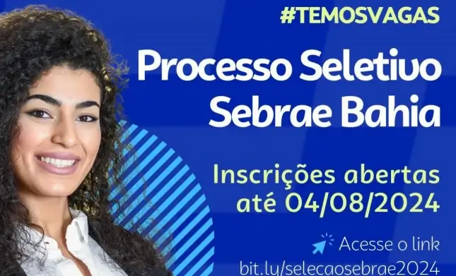 Inscrições devem ser feitas pelo site da Fundação CEFET Bahia, somente até 04/08/2024, onde também está disponível o comunicado completo (acesse em: bit.ly/selecaosebrae2024)