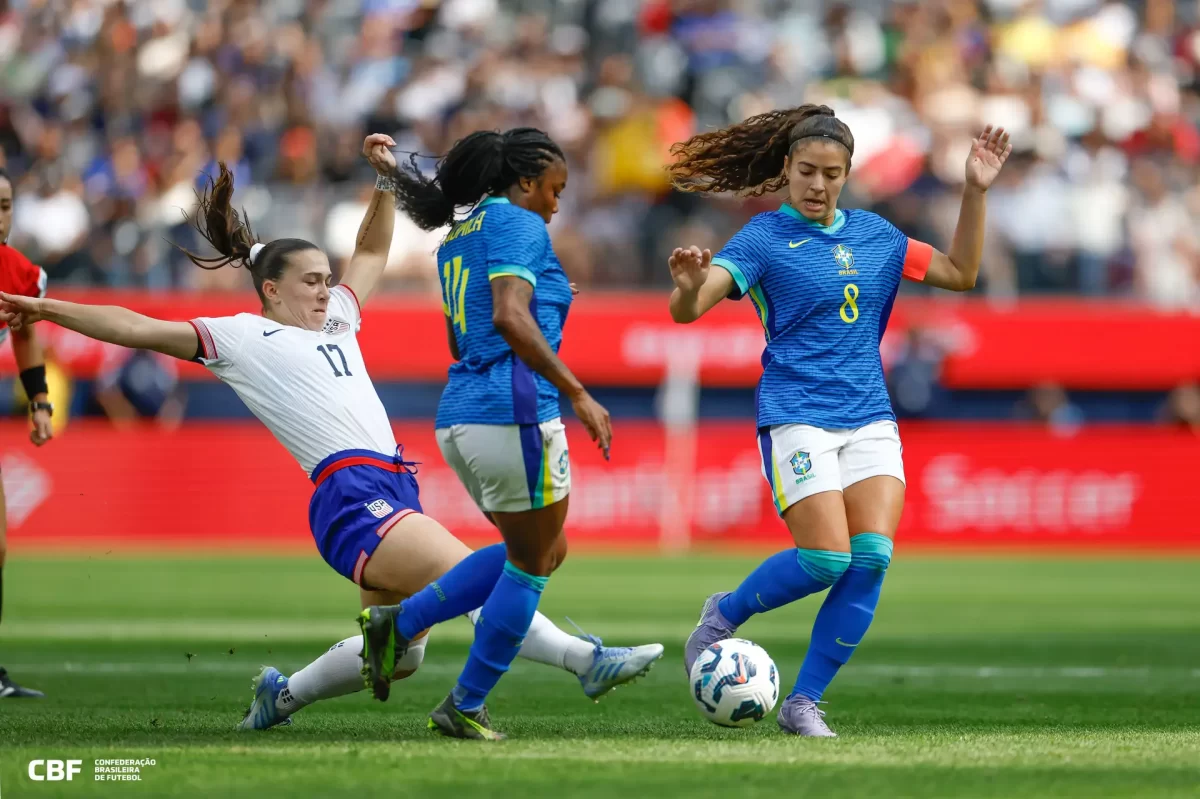 A Seleção Brasileira perdeu para os Estados Unidos por 2 a 0, na noite deste sábado (5), em amistoso disputado no SoFi Stadium, em Los Angeles. Foi a primeira vez que as duas equipes se enfrentaram após a final olímpica de 2024, em Paris – naquela oportunidade os EUA ganharam por 1 a 0. Apesar da derrota, o time comandado por Arthur Elias criou várias chances e obrigou a goleira Joyce a fazer grandes defesas. Pelo lado do Brasil, Lorena também se destacou em momentos importantes do jogo.