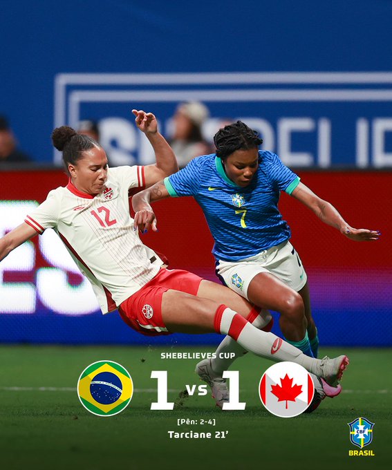 A seleção feminina de futebol terá que disputar o terceiro lugar da Copa SheBelieves, torneio realizado nos Estados Unidos e que serve de preparação para a Olimpíada de Paris, na França. Neste sábado (6), as brasileiras foram superadas nos pênaltis pelo Canadá, no Estádio Mercedes-Benz, em Atlanta, por 4 a 2, após empate por 1 a 1 no tempo normal, em uma das semifinais da competição amistosa. A partida foi transmitida ao vivo pela TV Brasil.