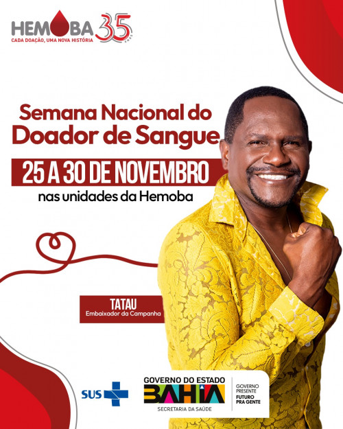 Com o tema “Cada doação, uma nova história”, a Semana do Doador, que acontece de 25 a 30 de novembro, celebra o aniversário de 35 anos da Fundação Hemoba. Neste ano, o cantor Tatau, ex-vocalista da banda Ara Ketu, será o embaixador da campanha, que terá em sua programação, nas unidades da capital e no interior, apresentações musicais, distribuição de brindes, estandes de maquiagem e artesanato. A Semana Nacional do Doador acontece em todos os hemocentros do país, em comemoração ao Dia Nacional do Doador Voluntário de Sangue, 25 de novembro. A data tem o objetivo de homenagear e agradecer aos doadores voluntários, além de conscientizar a população sobre a importância do ato de doar sangue.