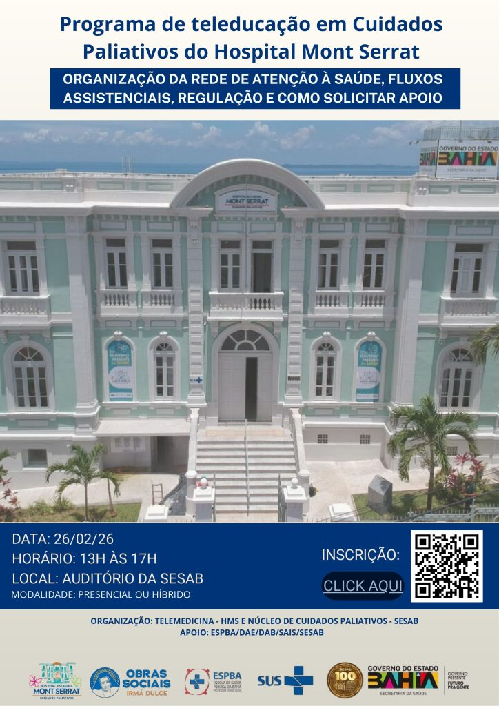 Estão abertas as inscrições para o Curso de Atualização em Cuidados Paliativos Básicos promovido pela Secretaria da Saúde do Estado da Bahia (Sesab), em parceria com o Hospital Mont Serrat – unidade vinculada ao Governo do Estado e administrada pelas Obras Sociais Irmã Dulce (OSID). Com carga horária de 80 horas e certificação emitida pela Escola de Saúde Pública da Bahia (ESPBA), a formação será oferecida de forma totalmente gratuita na modalidade de teleducação. O público-alvo inclui profissionais de saúde, gestores públicos, instituições da rede complementar e usuários do SUS. Serão disponibilizadas 150 vagas presenciais e cerca de mil online. As inscrições já podem ser realizadas por meio do formulário online disponível no card anexo (QR Code) ou através do link (clique aqui).