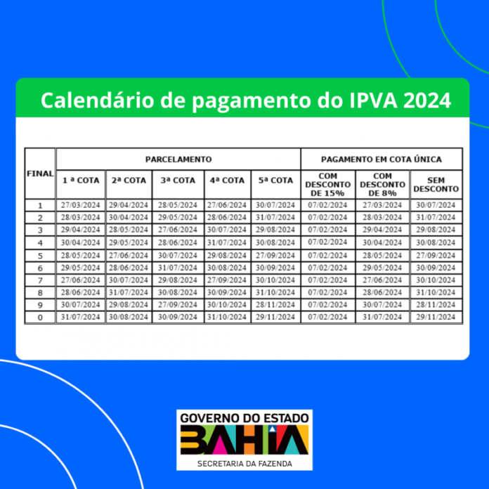 Os proprietários de veículos licenciados na Bahia têm até esta quarta (7), para aproveitar o desconto de 15% para pagamento antecipado, à vista, do Imposto sobre a Propriedade de Veículos Automotores (IPVA) de 2024. O abatimento, calculado de forma automática, vale somente para pagamento à vista do imposto, que pode ser feito pelos canais das instituições parceiras da Secretaria da Fazenda do Estado (Sefaz-BA): Banco do Brasil, Bradesco ou Bancoob.