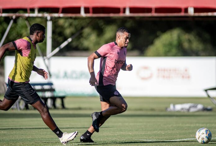Nesta quinta, Léo Condé voltou a exigir intensidade nos trabalhos realizados no campo Bebeto Gama no CT Manoel Pontes Tanajura. A agenda do dia foi aberta com aquecimento com rondos em espaços reduzidos, organizados pelo preparador físico Diego Kami Mura.