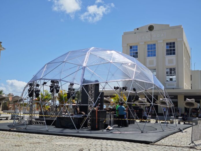 Ocupações – Entre os destaques do projeto, estão um túnel cenográfico com cobertura tensionada em lycra branca e lustres pendentes gigantes ao longo da Rua Chile, transformando o local em uma galeria a céu aberto; instalações instagramáveis como a Casa Submersa (espaço infantil interativo), o Coco Gigante (ponto de informações turísticas) e esculturas monumentais com humor visual.
